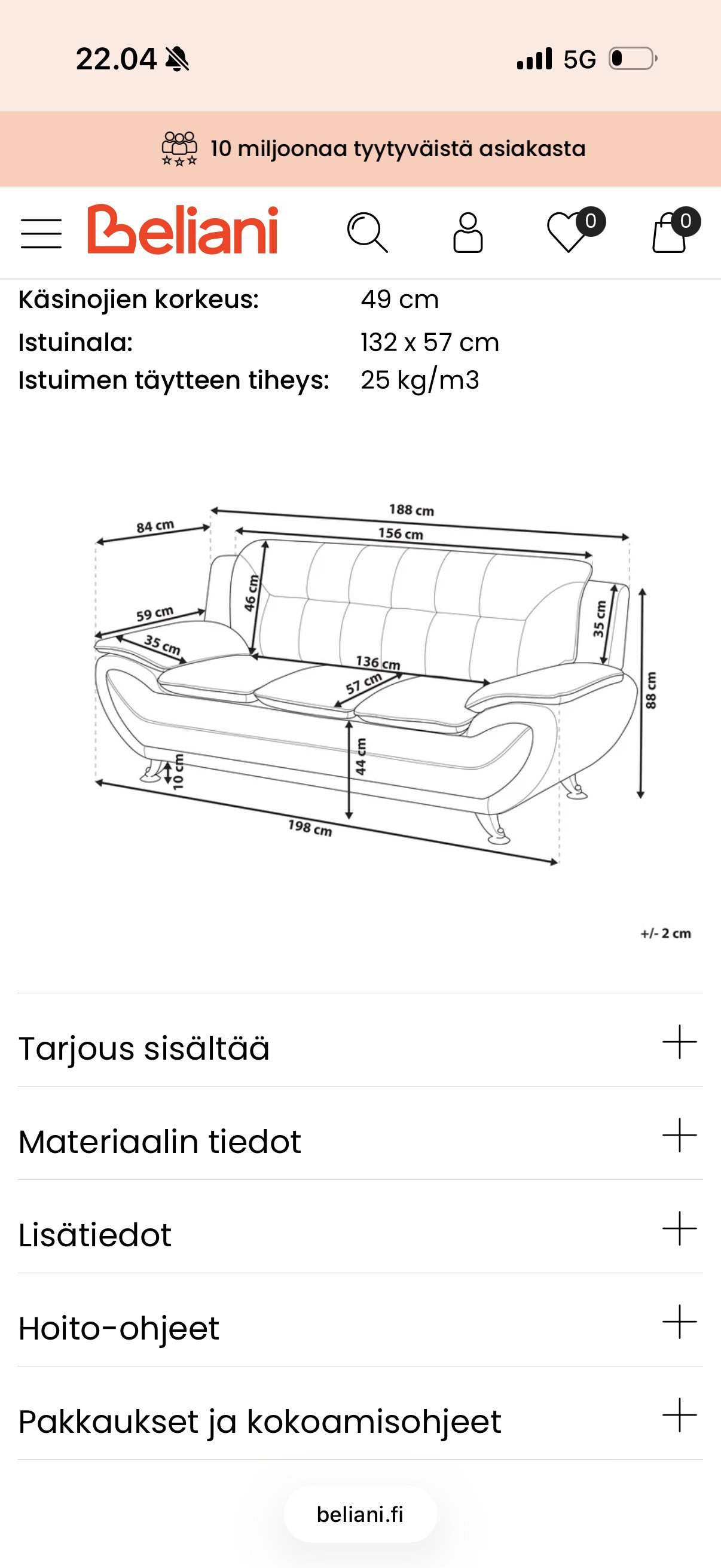 Mitat: Korkeus: 88 cm, Leveys: 188 cm, Syvyys: 84 cm