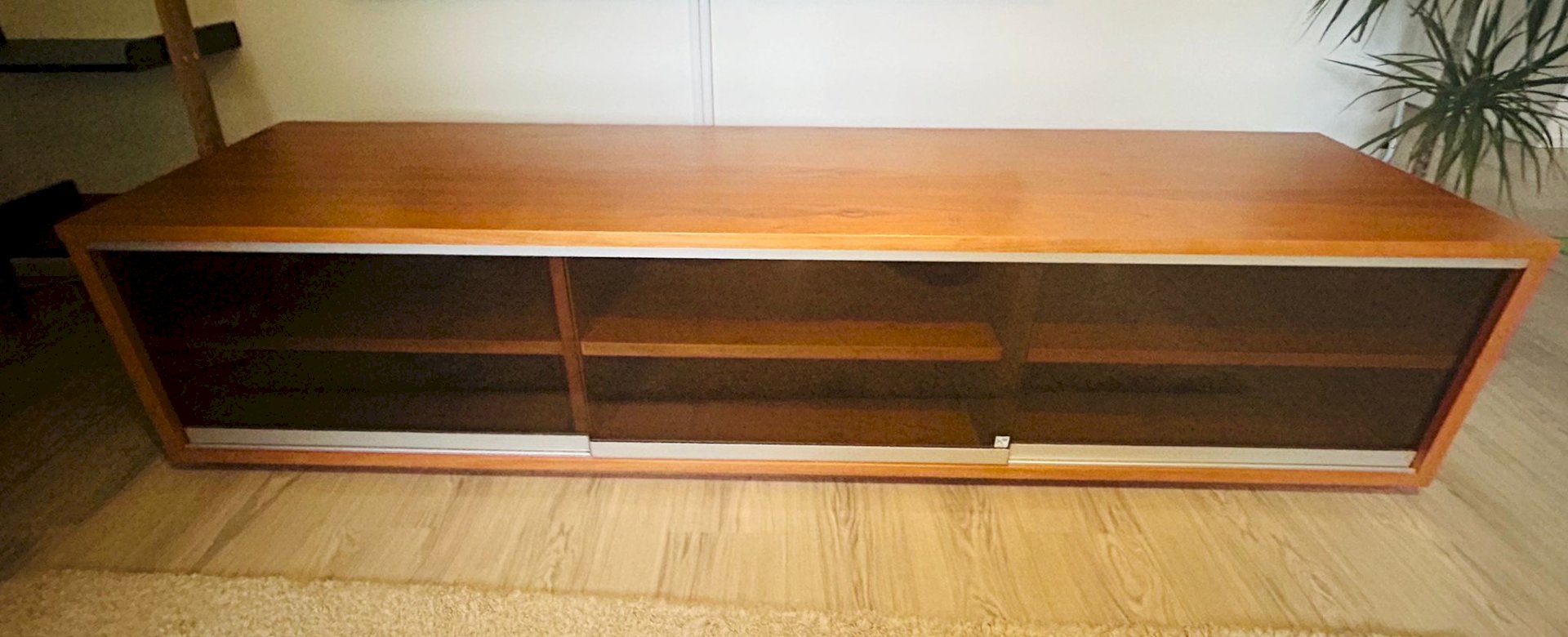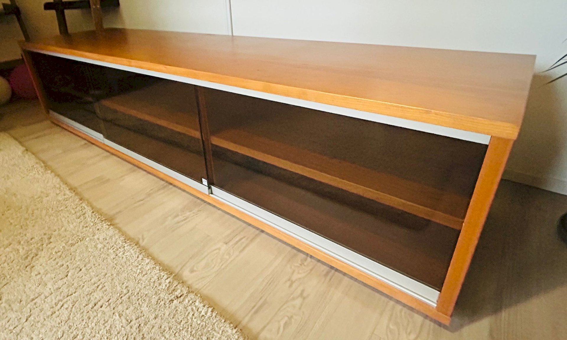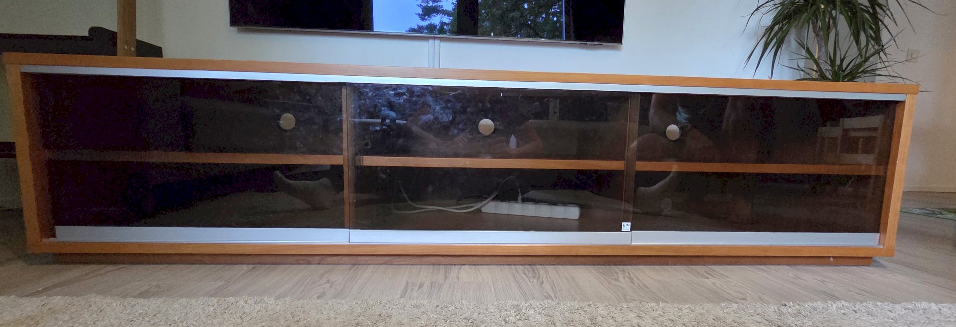 Materiaali pähkinäviilua. Tummennetut lasiovet. Tv-tason sisällä kuusi tilavaa hyllyä, joista viidessä läpivienti johdoille.