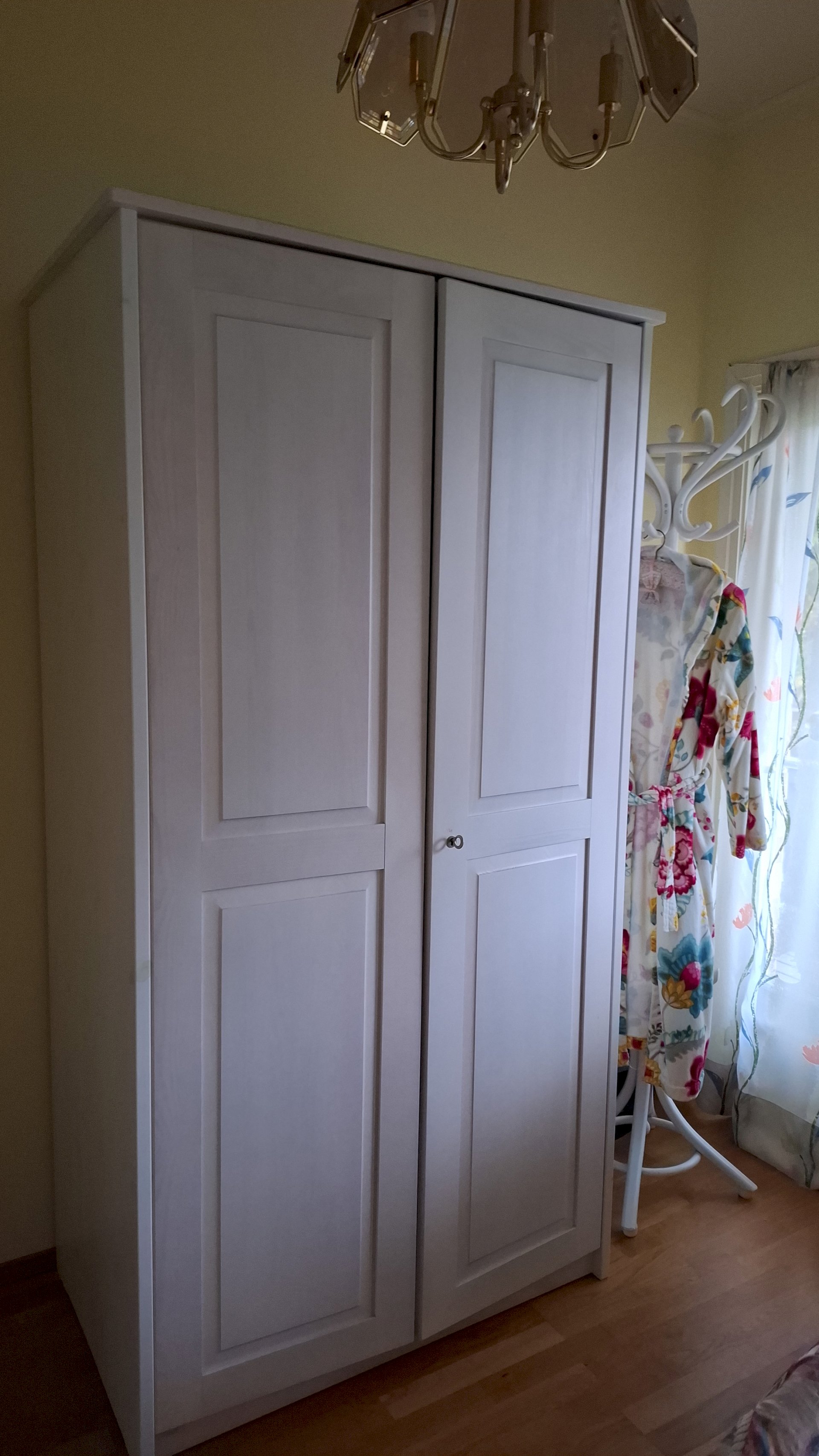 Kaapin tanko ja ajattomat peiliovet (ei deko-maalausta) ovat puuta ja kaapilla lukitusmekanismi avaimella.
